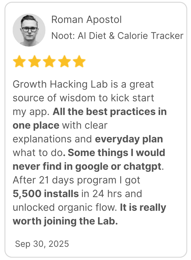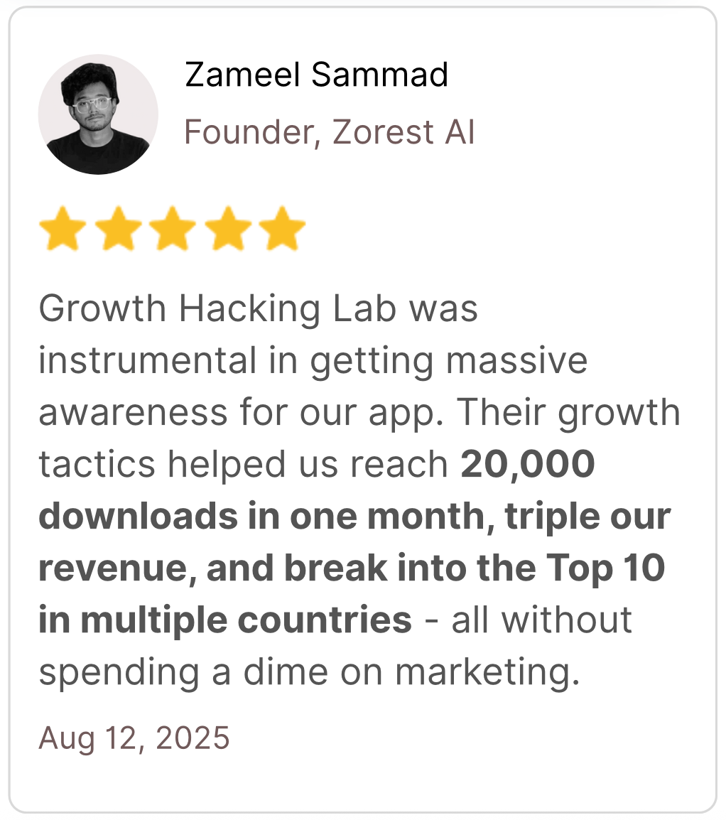 💬 "I added 1,000+ users in my first 30 days using just ONE tactic from the Growth Hacking Lab community. The ROI is insane." - Ankit Nayal, Founder of Flamme app