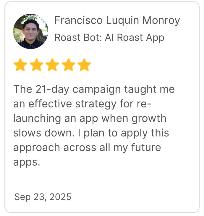 Every new member starts with our flagship 21-Day App Marketing Campaign. This is your step-by-step sprint to first traction.